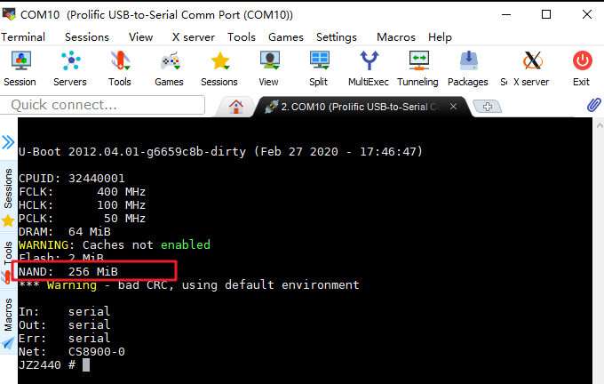 至此,添加对Nand Flash的支持完成,编译,下载到开发板,在串口查看结果,成功检测出了Nand Flash,并分析出大小为256MB:
