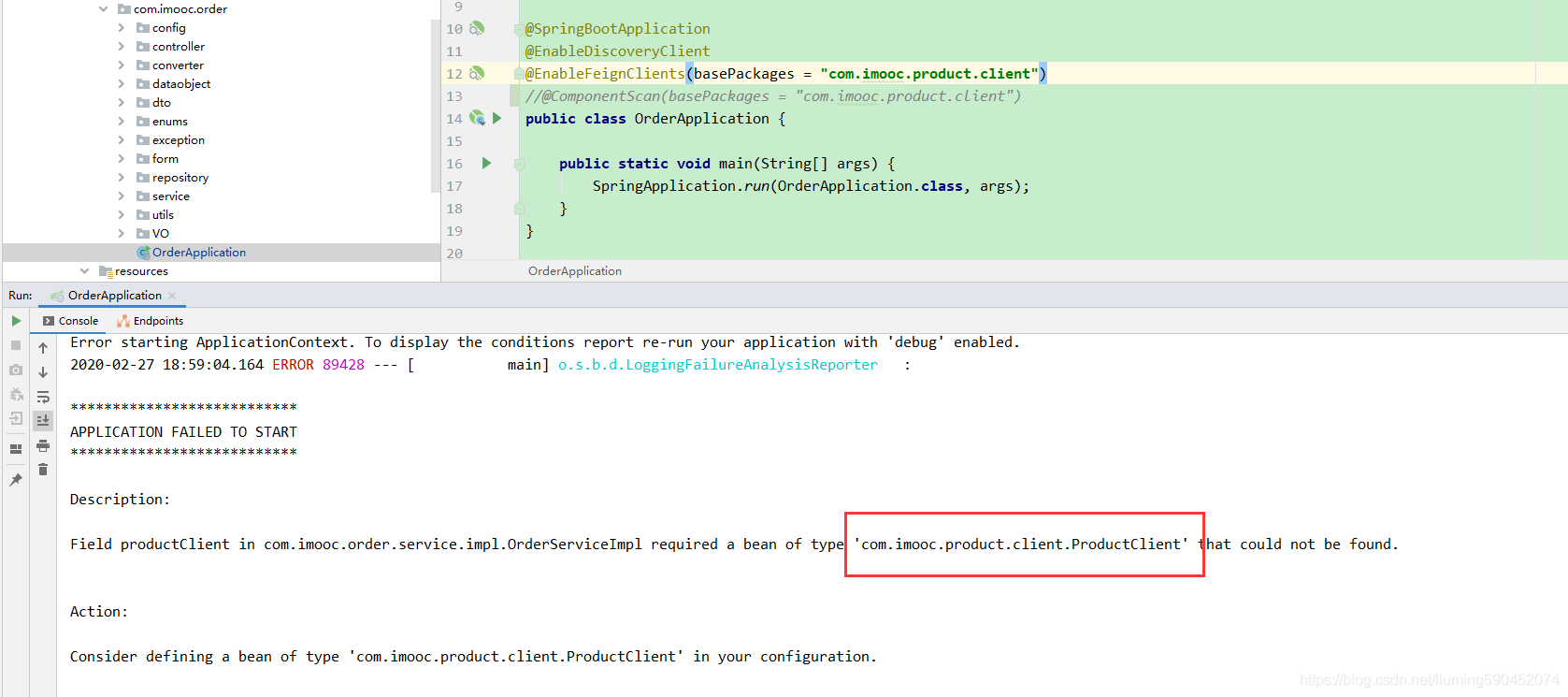 Field productClient in com.imooc.order.service.impl.OrderServiceImpl required a bean of type 'com.imooc.product.client.ProductClient' that could not be found.