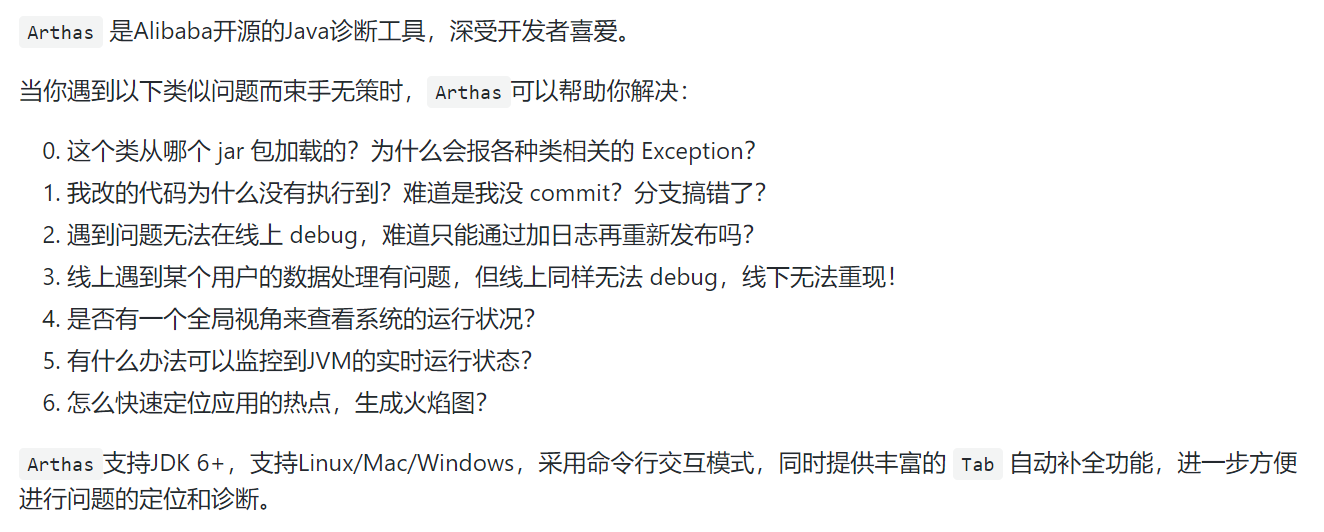 Arthas是阿里巴巴开源的Java诊断工具,采用命令行交互模式,是排查jvm相关问题的利器。