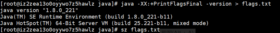 java -XX:+PrintFlagsFinal -version > flags.txt