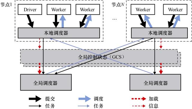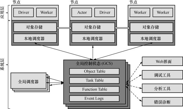 在系统层中,核心是全局控制存储(GCS),它存储所有最新的元数据并控制系统中的状态信息,通过这种集中式存储状态,GCS使其他每个组件都无状态了。这不仅简化了容错机制(故障时,组件重启并从GCS中读取最新的状态),并且可以轻松扩展(扩展的副本都可以从GCS中获取最新的状态)。