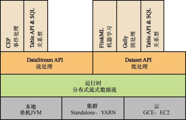 与Spark不同,Flink诞生较晚,但具有很强的后发优势,尤其是在流处理方面。另外,Flink也用Table API统一了流和批的处理方式,这点与Spark的DataFrame API类似,但是比Structured Streaming要早。图16-6是Flink的架构图,FlinkML是Flink的机器学习库,Gelly是图处理框架。
