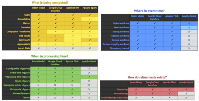 最后我们可以从Beam的角度来对比下Spark、Dataflow和Flink,Beam官网从“3W1H”这4个维度来横向比较Flink、Spark、Dataflow以及多种主流计算框架,如图16-7所示。