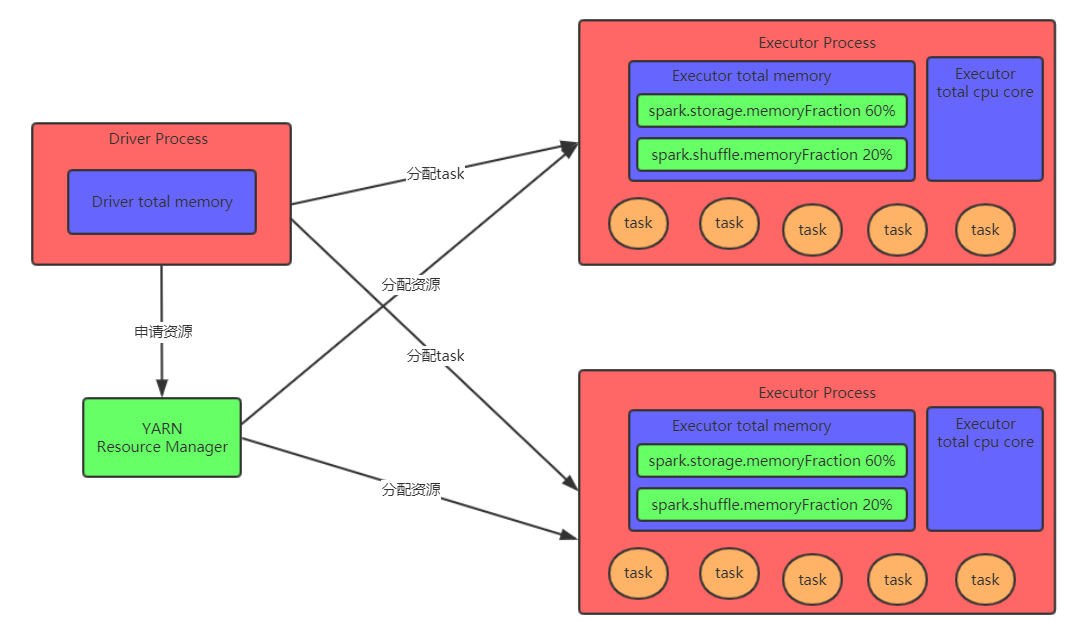 因此Executor的内存主要分为三块:第一块是让task执行我们自己编写的代码时使用,默认是占Executor总内存的20%;第二块是让task通过shuffle过程拉取了上一个stage的task的输出后,进行聚合等操作时使用,默认也是占Executor总内存的20%;第三块是让RDD持久化时使用,默认占Executor总内存的60%。