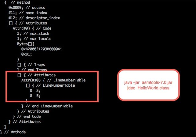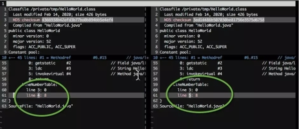 通过对比两次生成的字节码,我们终于发现了这个变动,是一个叫做LineNumberTable的结构引起的。