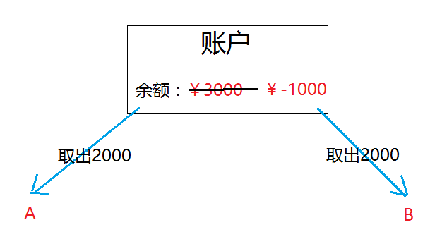 1、多个线程执行的不确定性引起执行结果的不稳定 2、如:多个线程对账本的共享,会造成操作的不完整性,会破坏数据如下图,账户原始余额为3000,A和B同时(并发)从账户中取出2000元,账户余额变成-1000,这种问题就是线程安全问题。