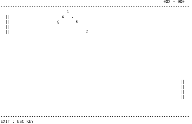 游戏时,输入任意一个字符串(如go1.6.2),该字符串会沿直线运动,遇到上下边界或左右围栏则镜面反弹。左侧围栏由电脑自动控制,右侧围栏由玩家操作。游戏的目标是控制右侧围栏在垂直方向的位置,使得字符串不断被碰撞反弹。