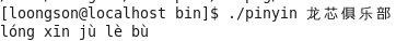 将任意汉字转换成对应的汉语拼音。例如,输入“龙芯俱乐部”的执行情况如下: