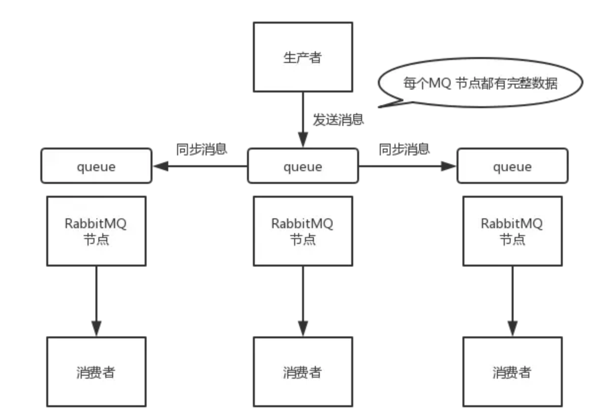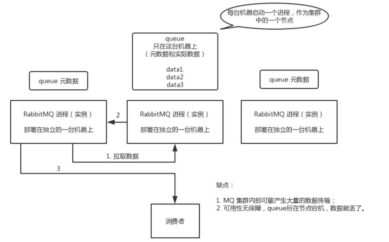 普通集群模式(无高可用性):在多台机器上启动多个 RabbitMQ 实例,每个机器启动一个实例。创建的 queue,只会放在其中一个 RabbitMQ 实例上,但是每个实例都同步 queue 的元数据(元数据可以认为是 queue 的一些配置信息,通过元数据,可以找到 queue 所在实例)。消费的时候,实际上如果连接到了另外一个实例,那么那个实例会从 queue 所在实例上拉取数据过来。