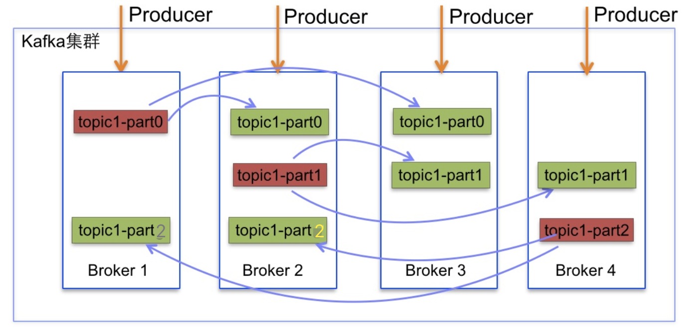比如说,我们假设创建了一个 topic,指定其 partition 数量是 3 个,分别在三台机器上。但是,如果第二台机器宕机了,会导致这个 topic 的 1/3 的数据就丢了,因此这个是做不到高可用的。