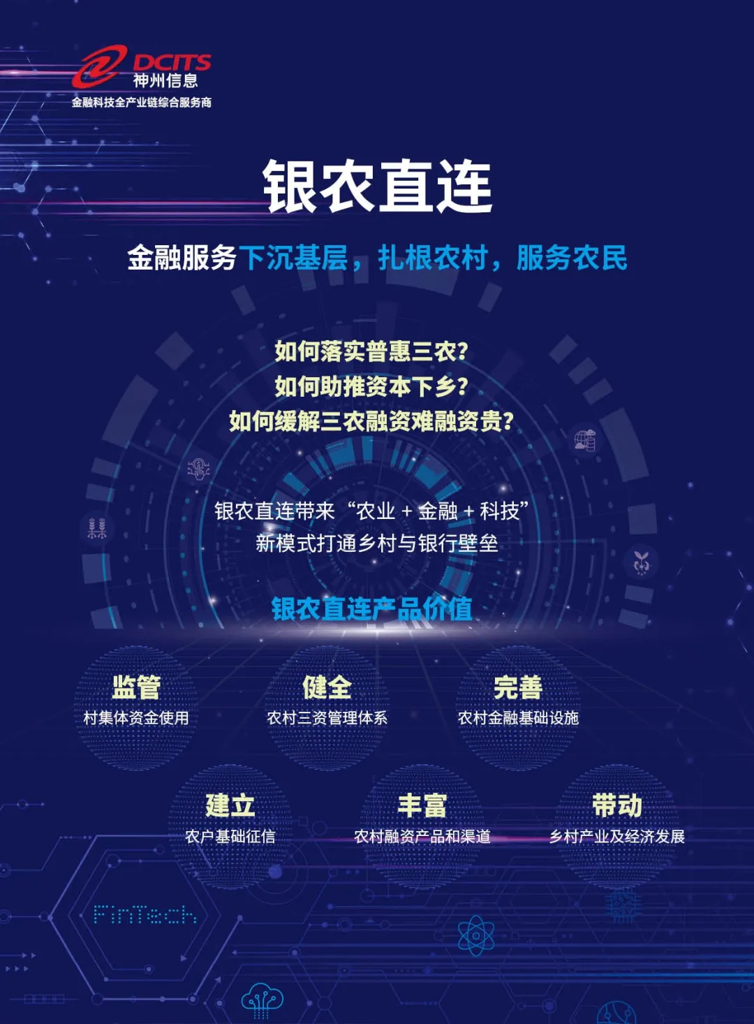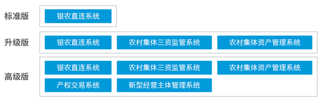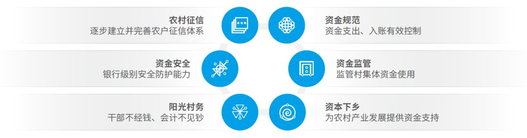 ● 以集体资金非现金结算系统——银农直连产品为核心,融合农村管理、农业生产经营服务相关的金融服务场景以及农业农村大数据,打造农业农村金融服务整体解决方案,助力金融服务下沉乡村基层,解决农村征信系统缺失、金融基础设施匮乏、融资难融资贵等问题,构建农业农村金融账户生态、交易结算生态、信贷生态,助推普惠三农、乡村振兴。
