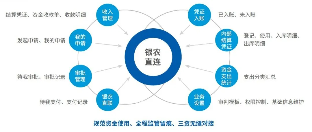● 通过财务软件系统和网银系统的在线直连,实现村集体资金非现金结算,监管集体资金使用,健全农村三资管理体系,助力阳光村务建设。