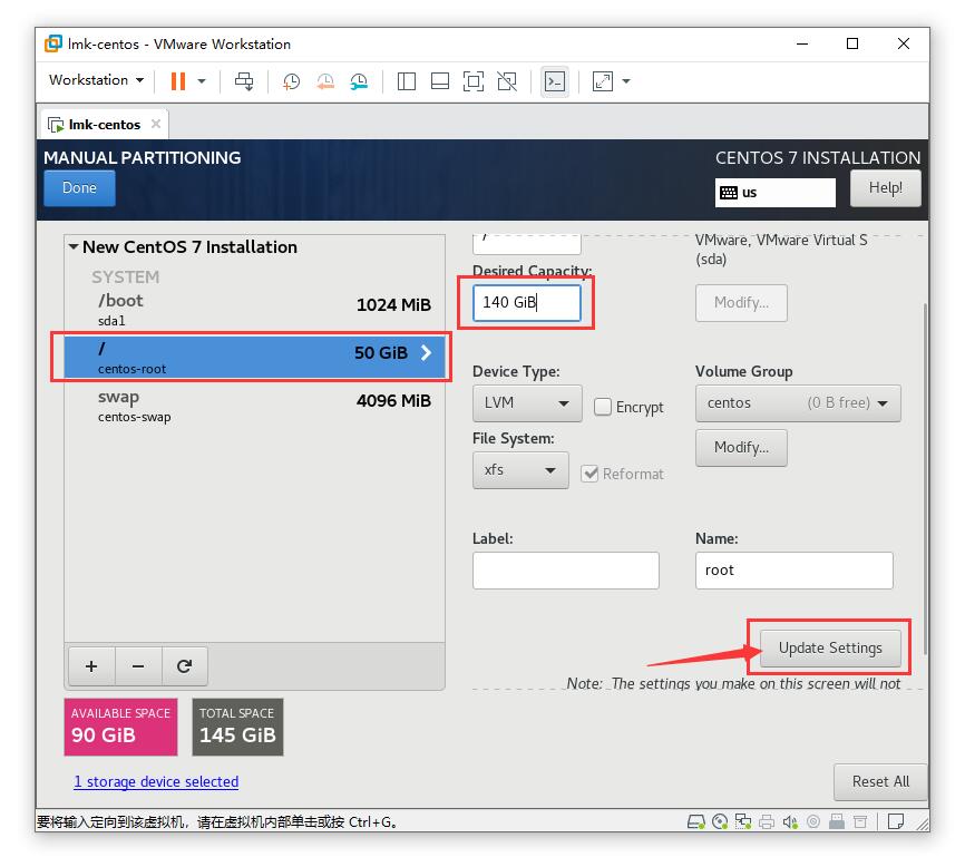 **设置根分区:**将剩余的磁盘空间全都挂载到系统根目录 / 。鼠标点击 / 分区,在右侧编辑面板中,将其容量调到最大(可适当超出磁盘总容量,安装工具会自动计算识别)。然后点击右下角的 【Update Settings】按钮,更新设置: