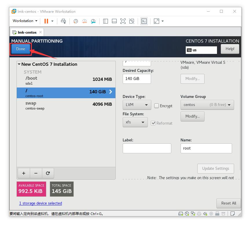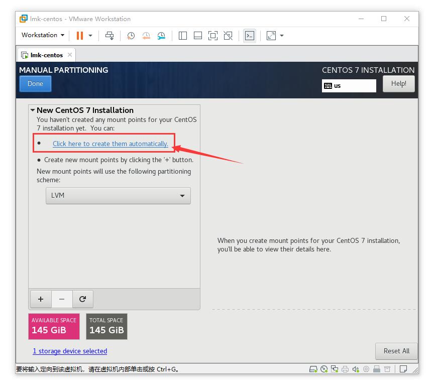 CentOS 7中默认使用LVM进行分区管理,我们先点击【Click here to create them automatically.】,安装程序会自动创建一个分区方案:
