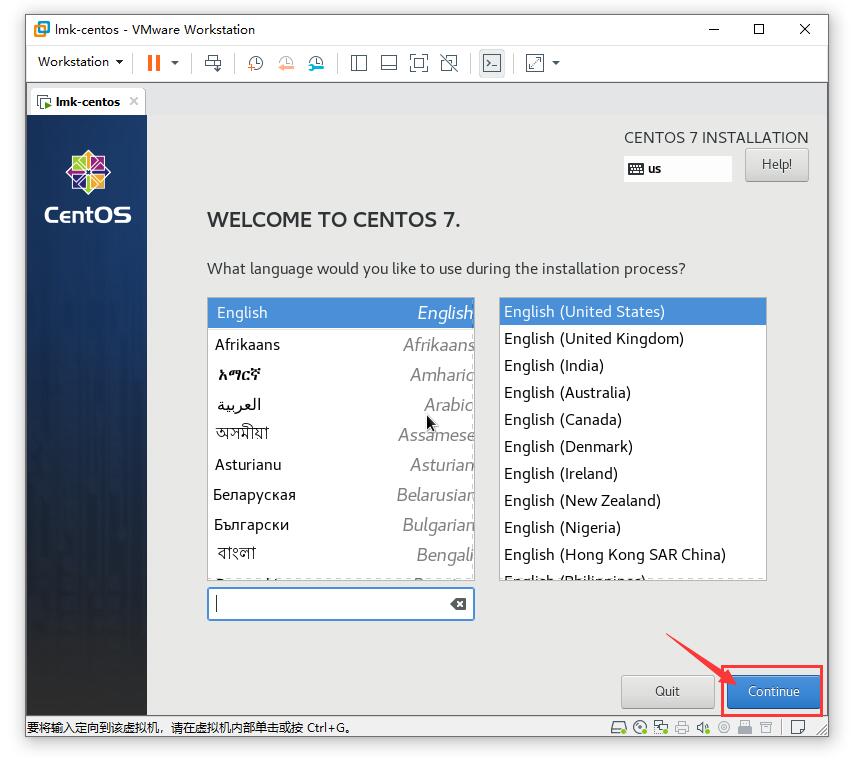 语言选择: 这里要选择接下来安装过程中,窗口界面的语言类型。我们保持默认的英语,然后点击【Continue】按钮: