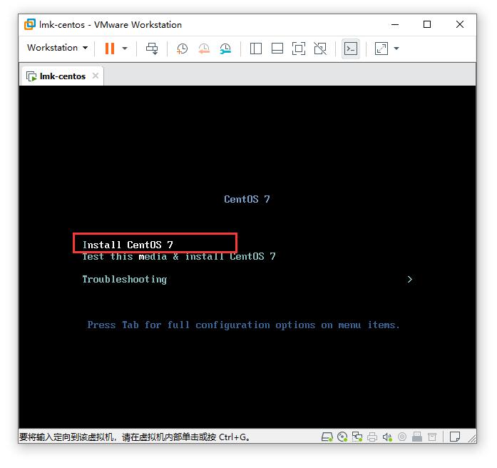 运行模式: 当虚拟机从光驱启动后,屏幕上会提示选择运行模式。我们通过上下方向键选择第一个菜单项【Install CentOS 7】,然后回车: