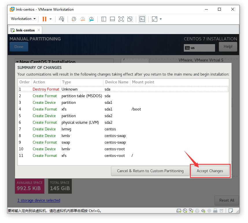 这时安装程序会再次确认分区规则,我们点击右下角的【Accept Changes】按钮,应用配置: