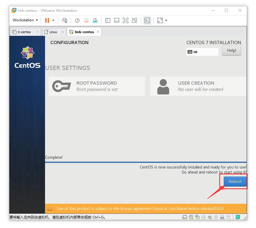 我们只需要点击 【Reboot】按钮重启系统,CentOS也就顺利安装完成了!
