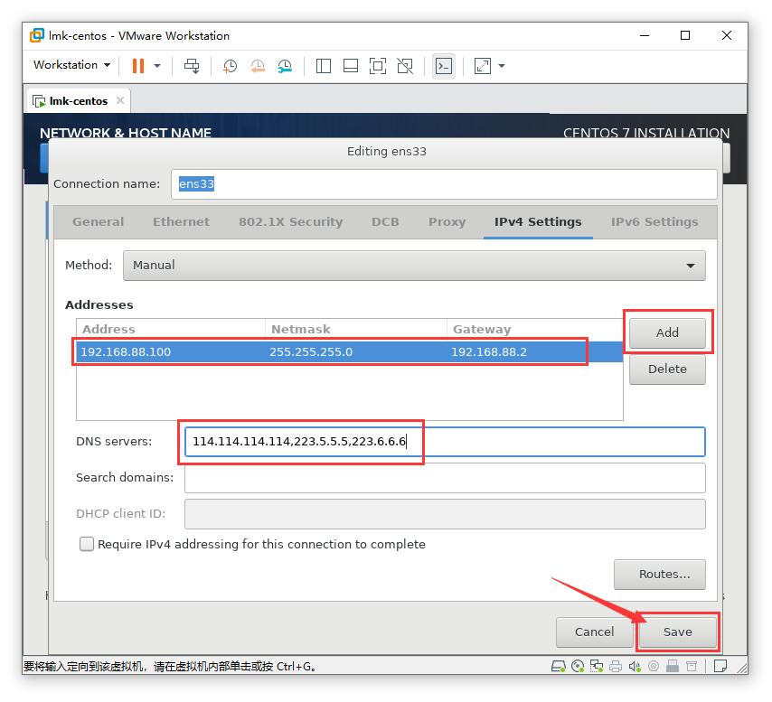 在配置窗口中,点击右侧的 【Add】按钮添加配置。然后在【Address】框中详细设置IP地址、子网掩码、默认网关等参数。在【DNS servers】输入框中可以设置域名解析服务器的IP,我们添加了三个:114.114.114.114、223.5.5.5、223.6.6.6,中间用英文的逗号隔开。最后点击右下角的 【Save】按钮保存配置。 如: