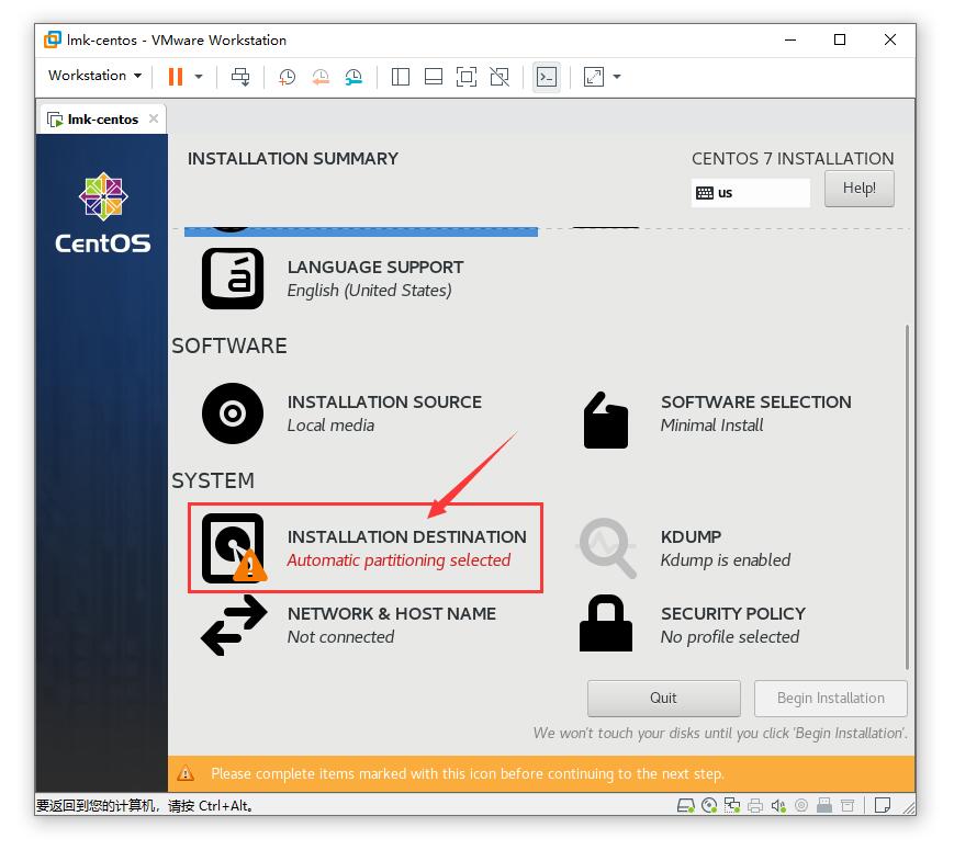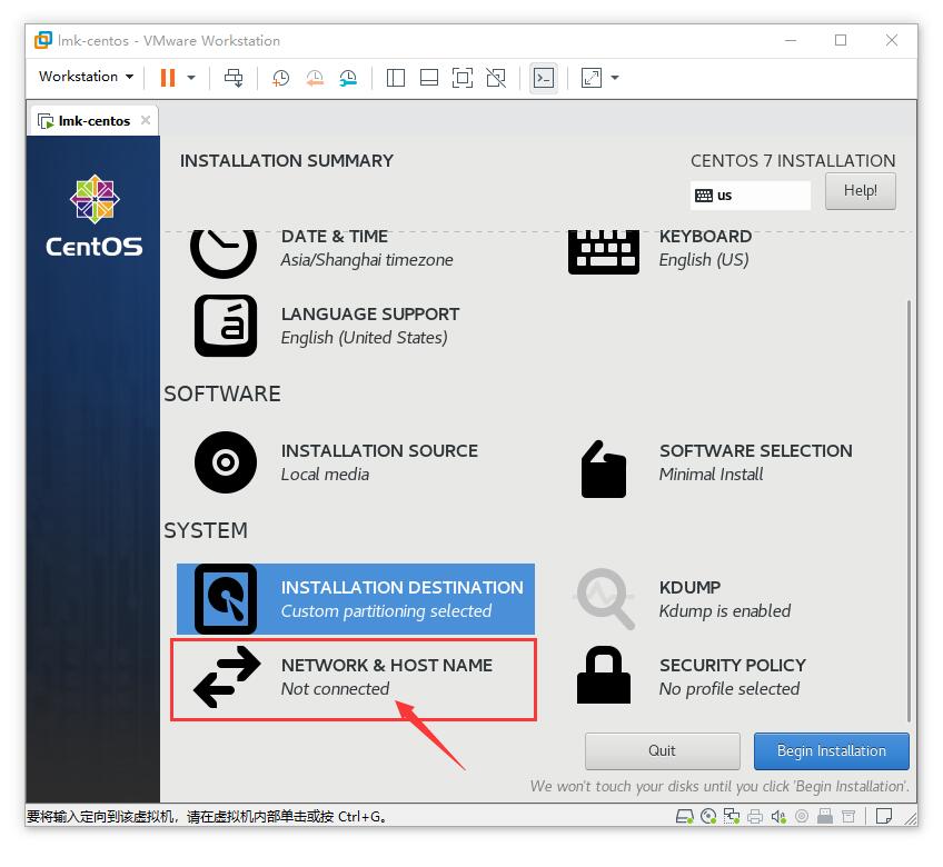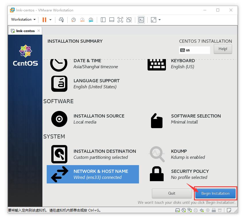 到这里,主要的安装前配置就已经完成了。接下来我们点击右下角的 【Begin Installation】按钮,开始安装系统: