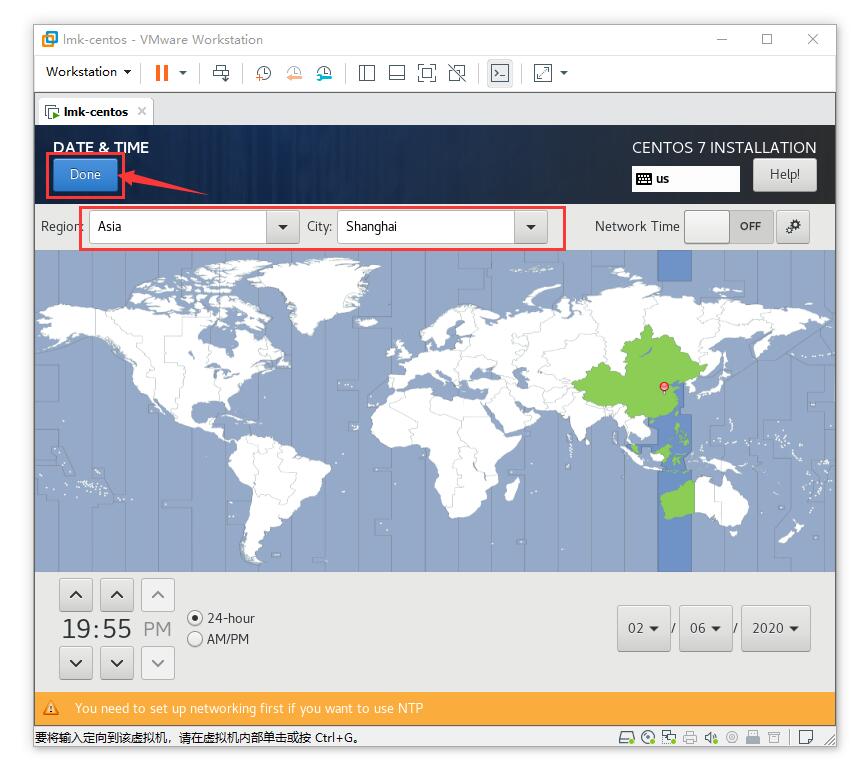 系统时间: 这里我们主要设置时区,用鼠标点击世界地图中的区域,选择【上海】,然后点击左上角的 【Done】按钮完成设置: