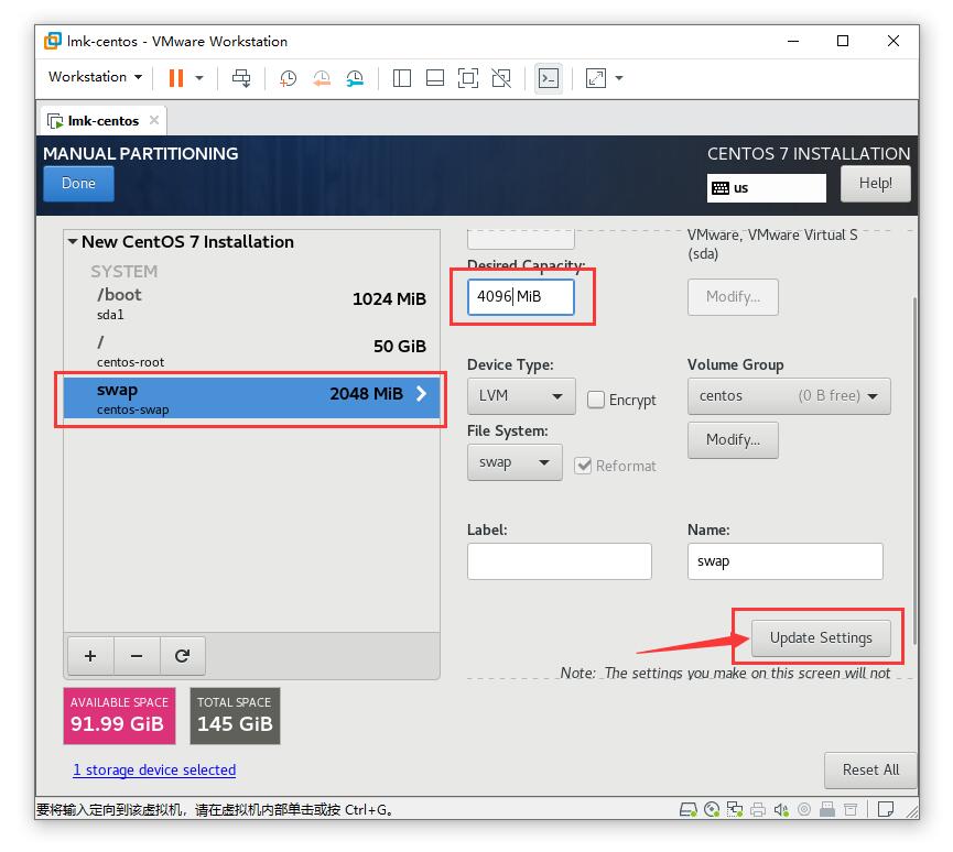 设置 swap 分区: 我们为系统预留4GB的虚拟内存。鼠标点击 swap 分区,在右侧编辑面板中,将其容量增到到 4096 MiB,然后点击右下角的 【Update Settings】更新设置: