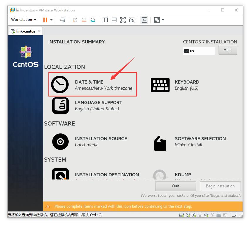 进入到主安装界面,我们可以在这里设置:【系统时间】、【磁盘分区】、【网络配置】等项目。