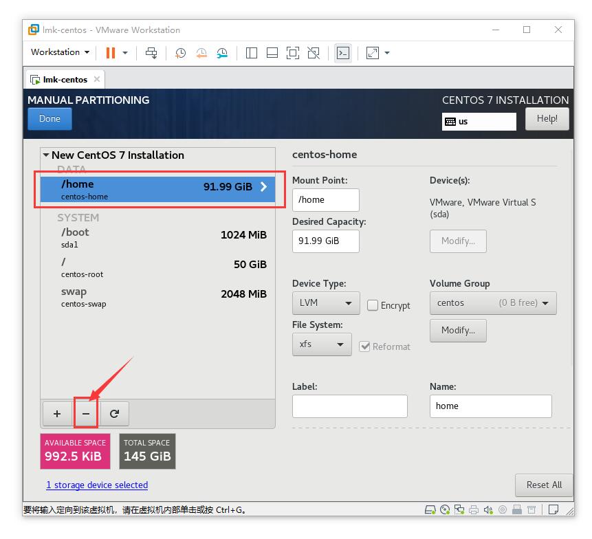 鼠标点击选中 /home 分区,然后点击左下角的 【-】 按钮,先将该分区删除: