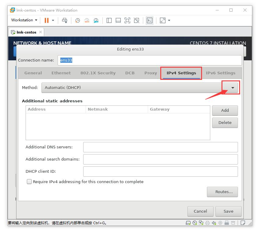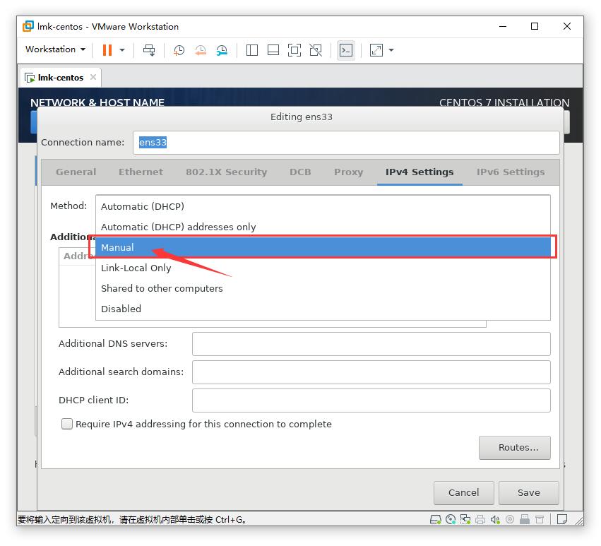 点击窗口头部的 【IPv4 Settings】标签页。然后点击 【Method】下拉框,从中选择【Manual】,将打开配置窗口: