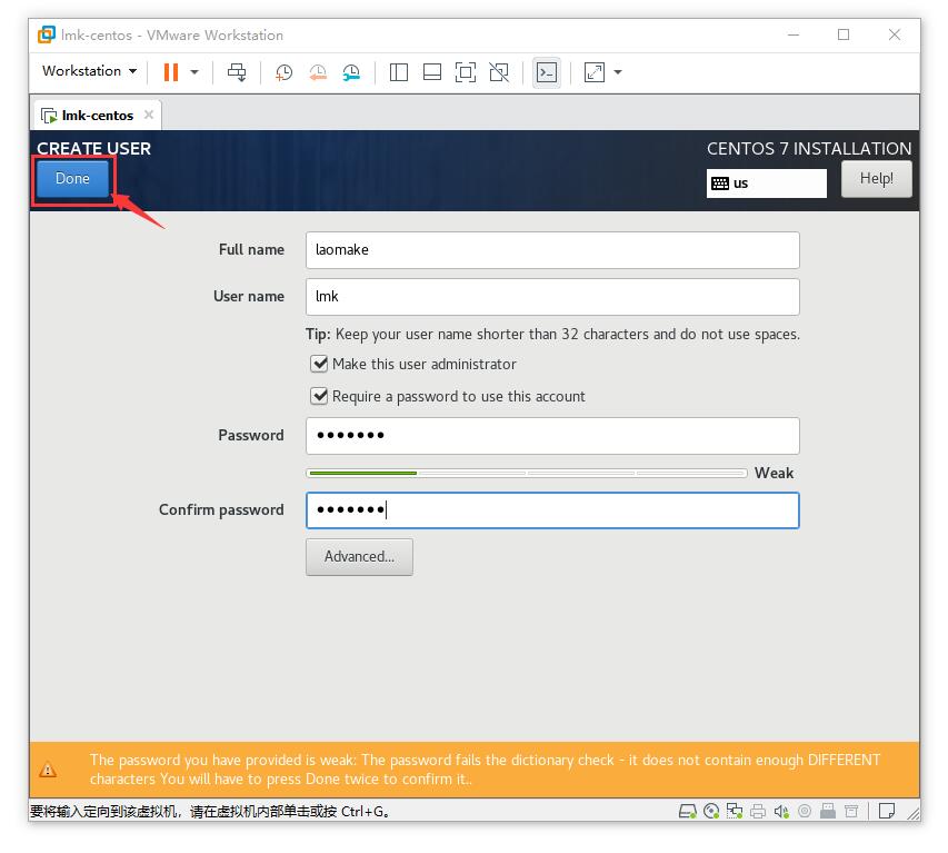 根据自己的喜好,设置用户全名、用户名和密码,然后点击左上角的 【Done】按钮完成创建。