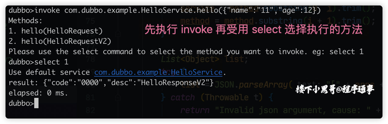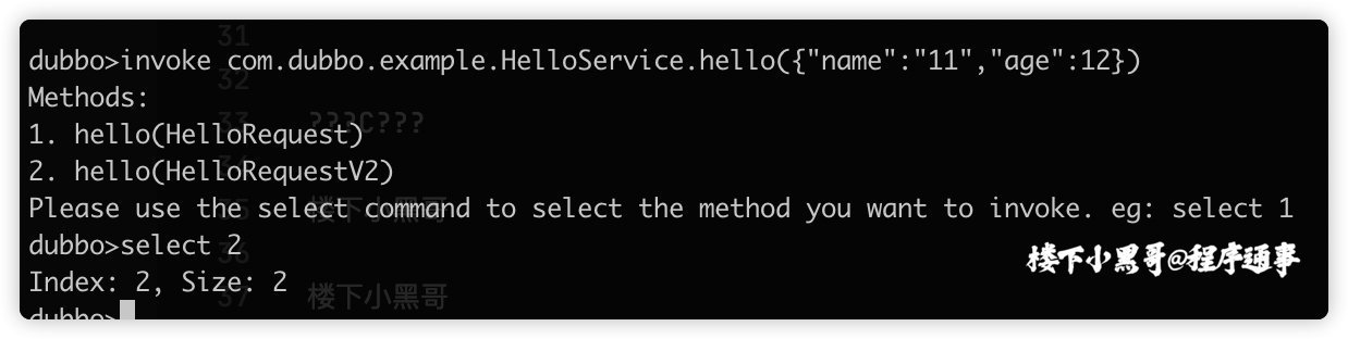 Dubbo 最新版本,如果服务存在多个相同参数的重载方法,且没有使用 class 来明确参数类型,提示用户使用新增的select 命令来选择要调用的方法。