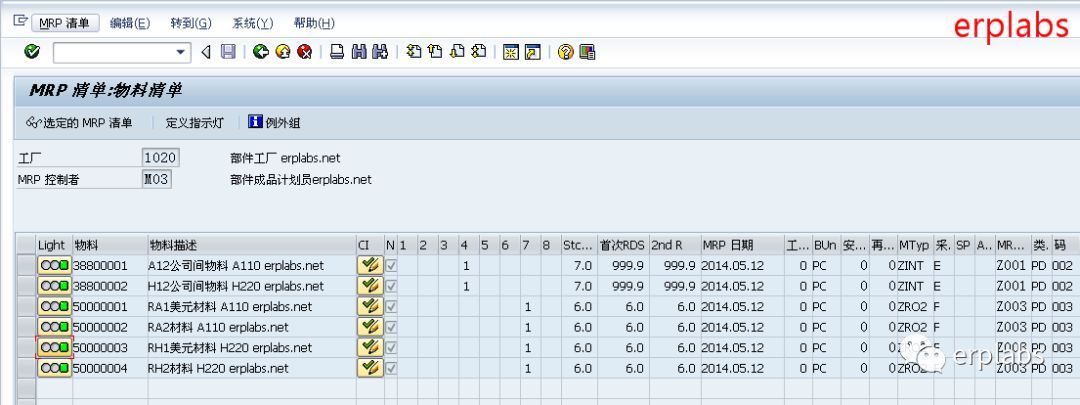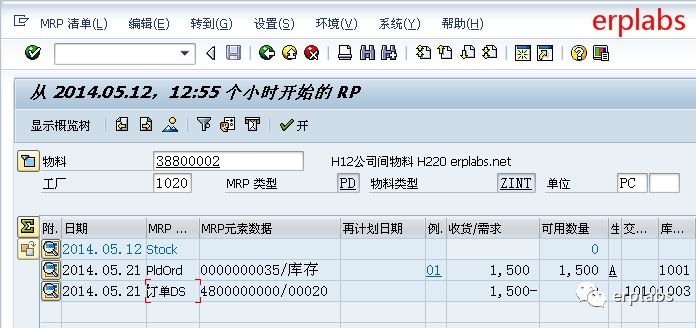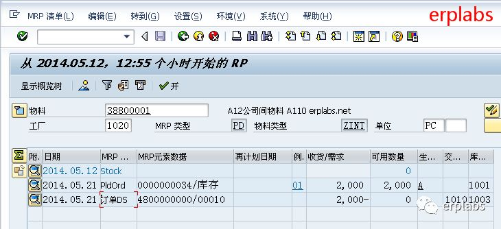 显示MRP计划运行结果,可看到根据STO公司间采购订单需求,1020部件公司已生成自己的相关物料需求。