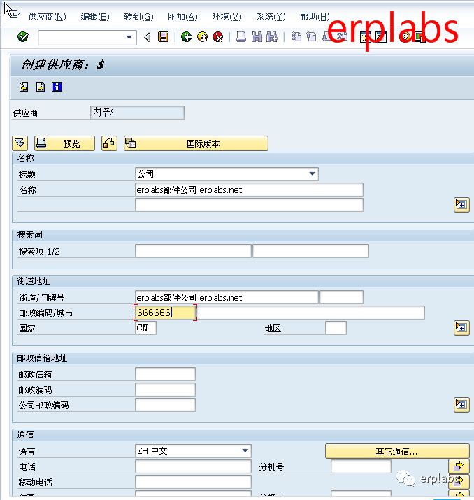 输入供应商名称部件公司,街道输入地址,国家CN,语言ZH中文,回车,进入下一界面