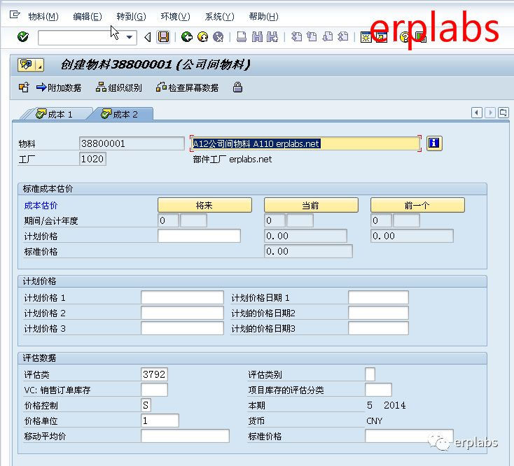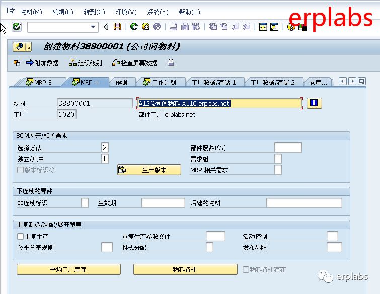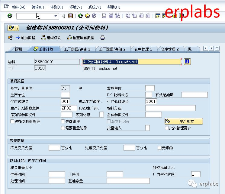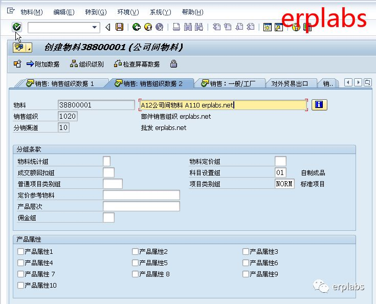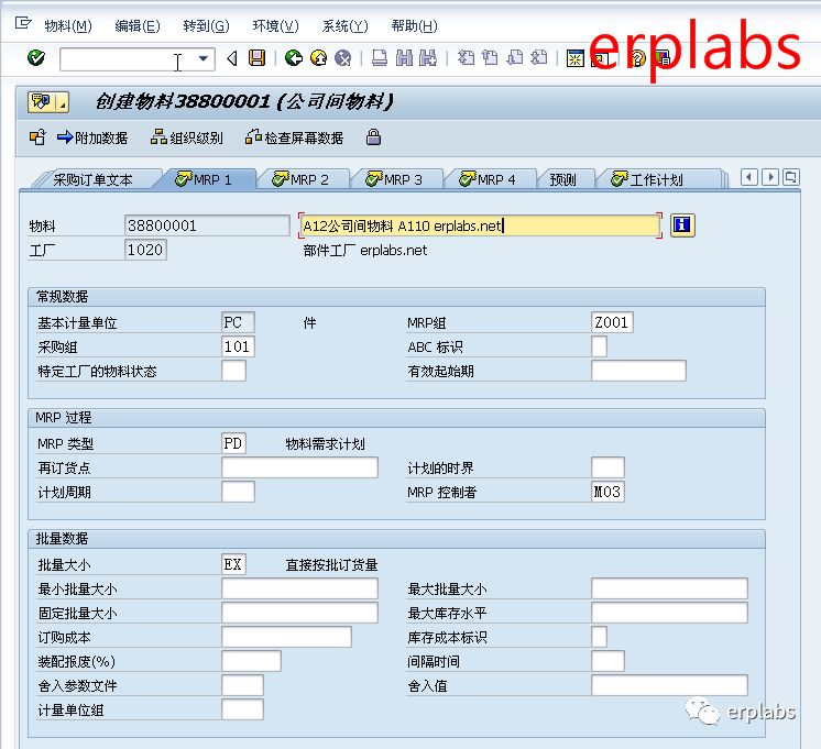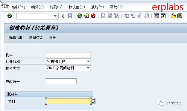 本案例已在1010公司创建38800001为原材料,物料框输入38800001,行业领域选择机械工程,物料类型选择ZINT公司间物料,回车,进入下一界面