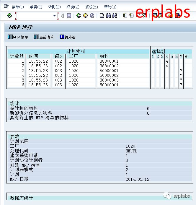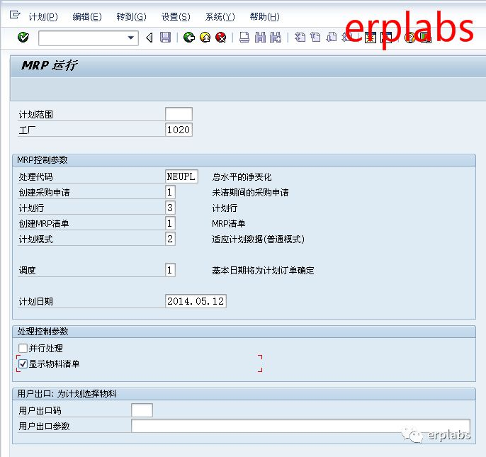 输入工厂1020部件公司,处理代码输入NEUPL,创建采购申请输入1,计划行输入3,创建MRP清单输入1,计划模式输入2,调度输入1,勾选显示物料清单,回车,进入下一界面