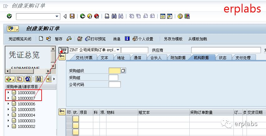 可看到右边显示采购申请,拖动单号到购物车中,或双击需要下单的申请单号,将复制申请到采购订单行项目中,如下图示