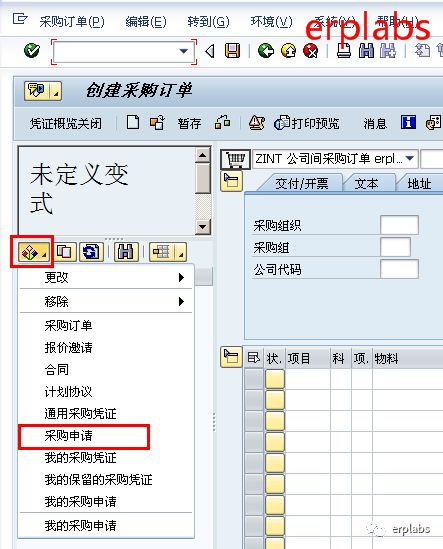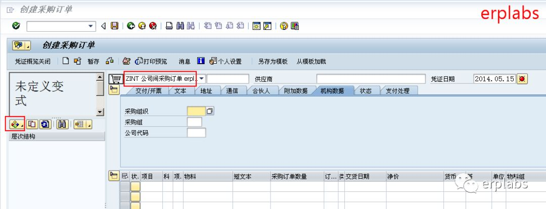 采购订单类型选ZINT公司间采购订单,在界面左边,点选择变式,如下图示
