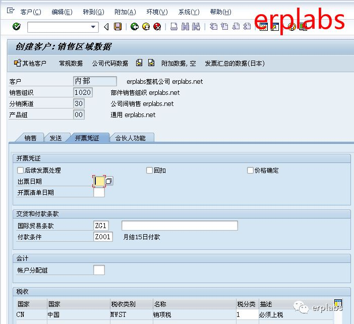 国际贸易条件ZG1,付款条件Z001月结15日付款,帐户分配组01国内收入,税分类1必须上税,保存。