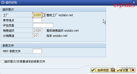 输入工厂1020、销售组织1020、分销渠道10,注意公司间物料在1020公司是成品需创建销售视图,回车,进入下一界面