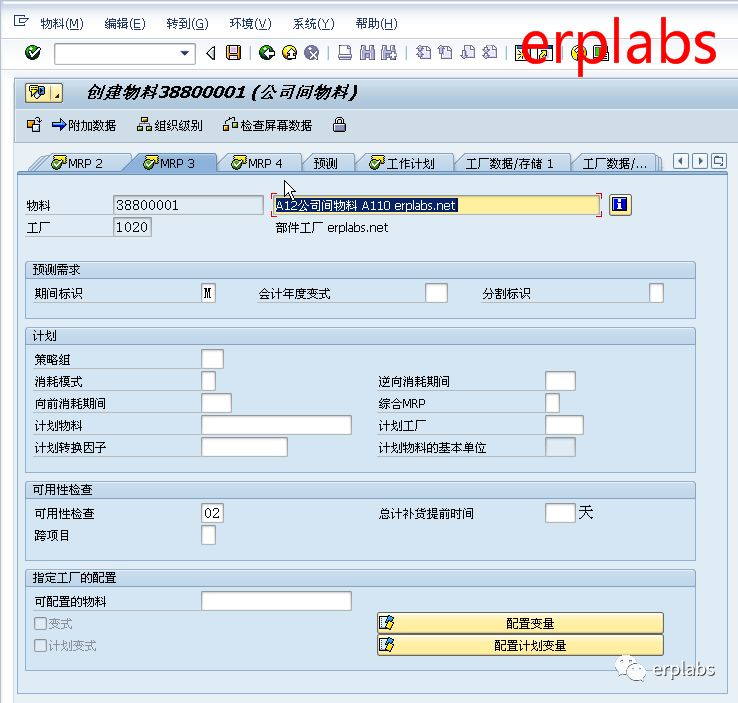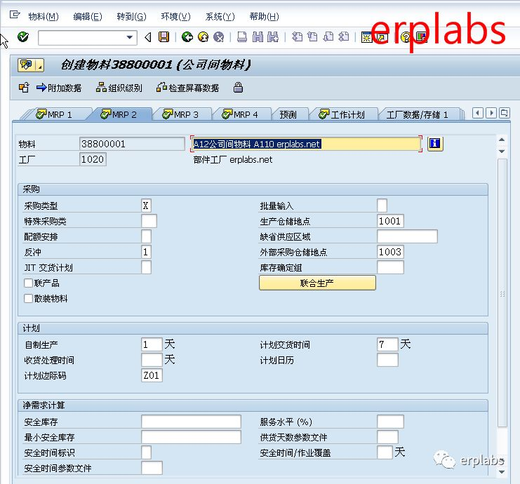 输入采购类型X自制或采购、反冲1一直反冲、生产仓储地点1001成品仓、外部采购仓储地点1003、自制生产1天、计划边际码Z01,点“MRP3”页,进入下一界面