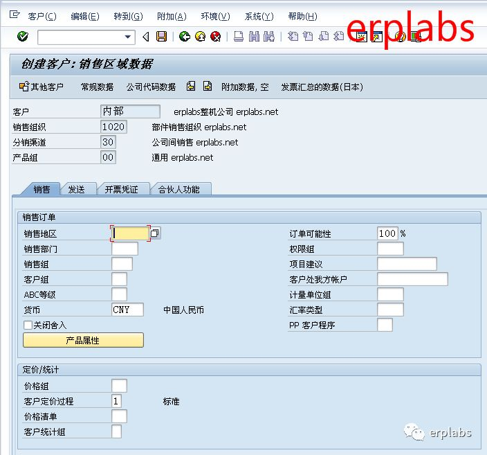 付款条件输入Z001月结15天,点“销售区域数据”按钮,进入下一界面