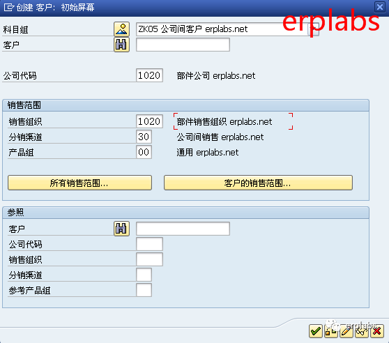 科目组选择ZK05公司间客户,输入公司代码1020部件公司,销售组织1020,分销渠道30公司间销售,产品组00通用,回车,进入下一界面