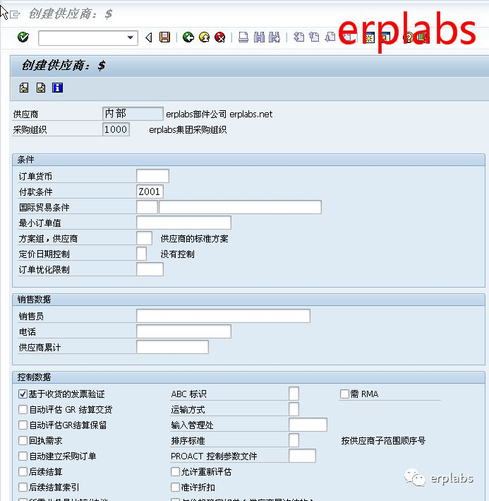 付款条件输入Z001,勾选“基于收货的发票验证”选项,保存供应商。