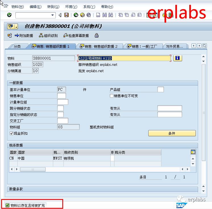 因已在1010公司创建38800001为原材料,所以提示“物料以存在且将被扩充”字样,基本视图不需要修改,点“销售:销售组织数据1”页,产品组输入00,物料料组01成品组,税分类1全额税,点“销售:销售组织数据2”页,进入下一界面