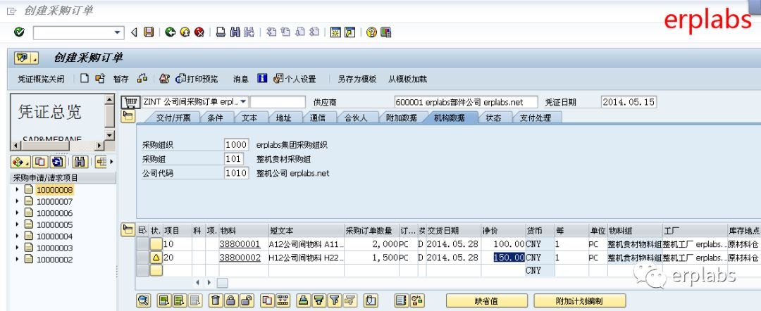 erplabs整机公司采购员根据采购申请,在SAP创建STO公司间采购订单,采购需求将自动传递到部件公司。本操作与MM采购模块章节内容重复。