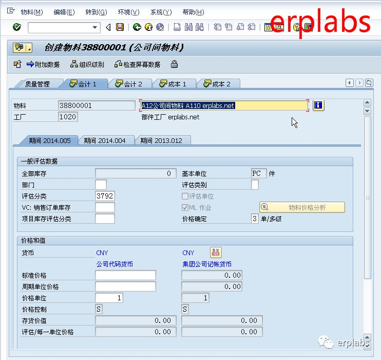 ML作业勾选表示启用物料分类帐,价格确定3单/多级一般用于成品和半成品,价格控制S标准价格灰色不能修改(价格确定是3的物料其价格控制只能是S),标准价格栏可输入估算价格。