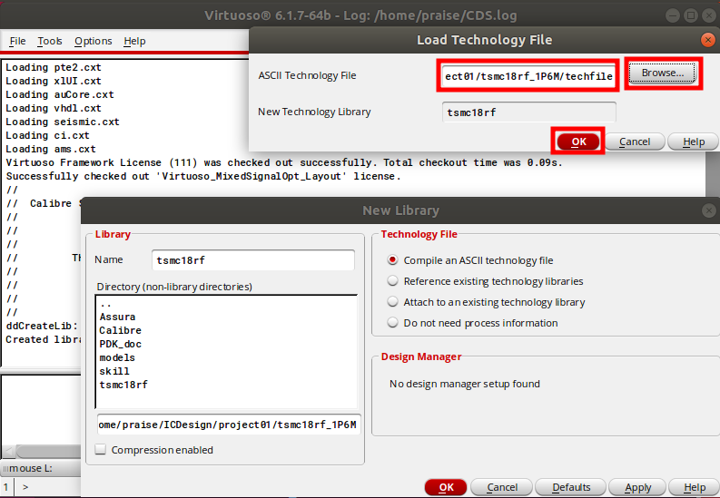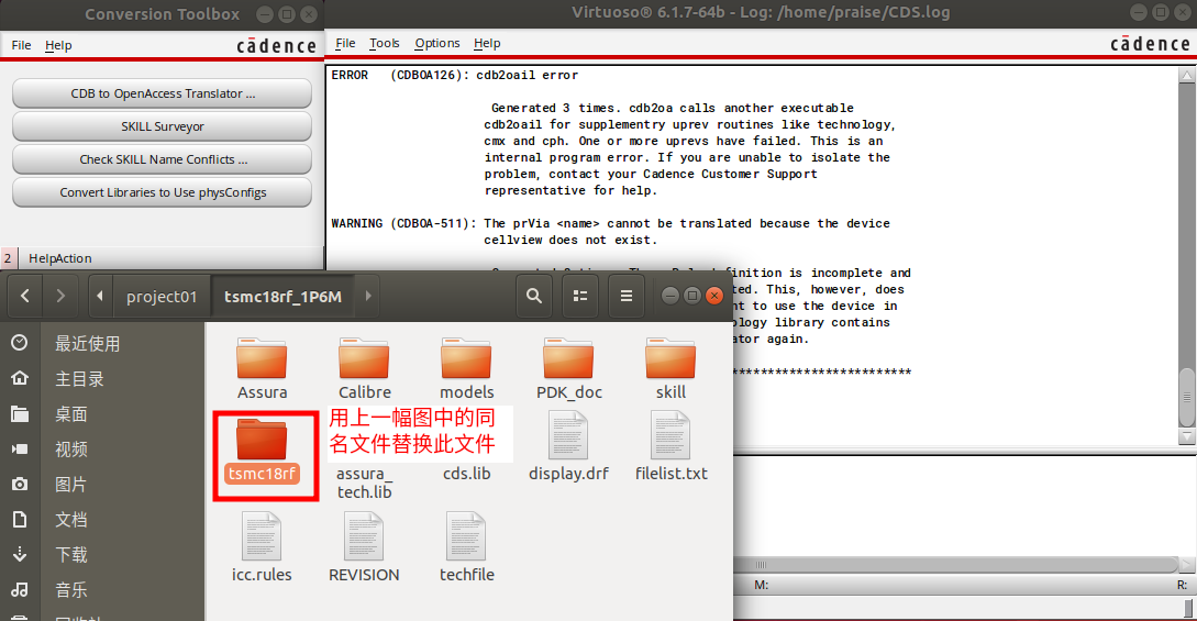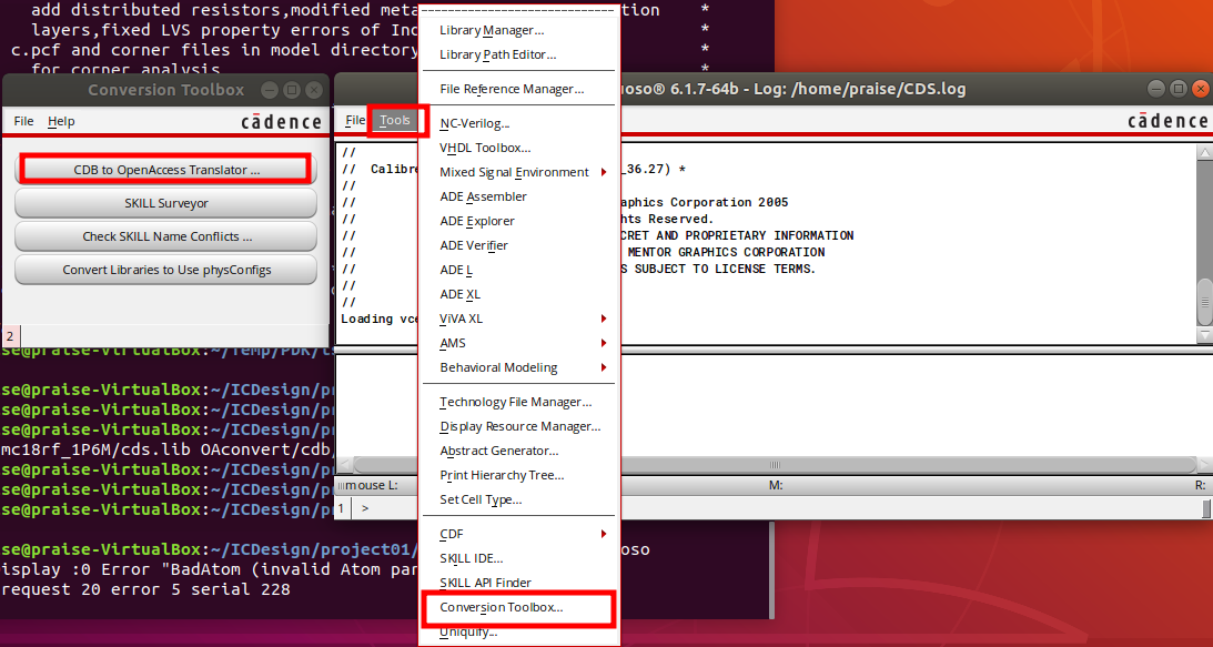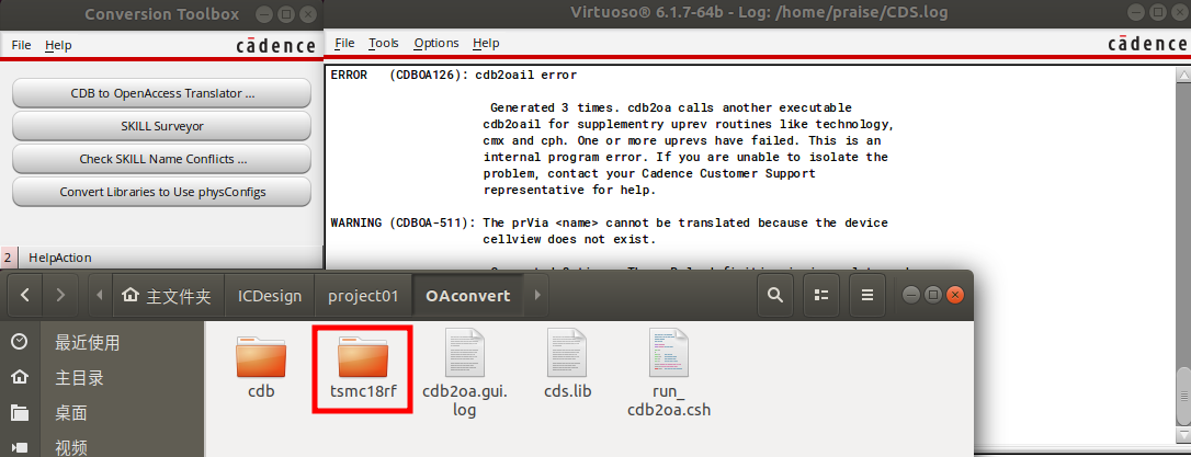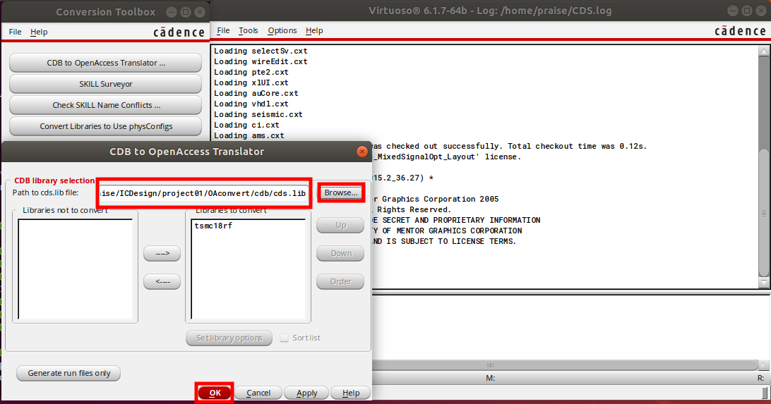 由于IC610以上的版本只能识别OA格式的PDK,而tsmc18rf采用的是CDB格式,因此需要用IC617自带的工具进行转换。执行以下指令为转换做准备。