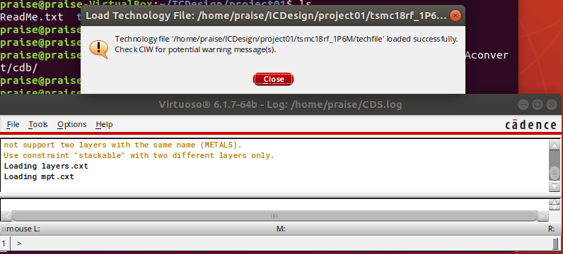 对于不同的工程,通常会采用不同的工艺和工艺库,因此把PDK安装在工程目录下。之前创建了project01作为测试,现在把这个工艺库安装在这个目录下。在tsmc18rf工艺库解压目录下直接执行如下语句进行安装。