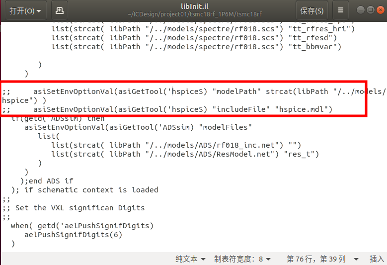 打开上面图中生成的tsmc18rf文件夹,找到libInit.il文件,将下面两行注释掉。