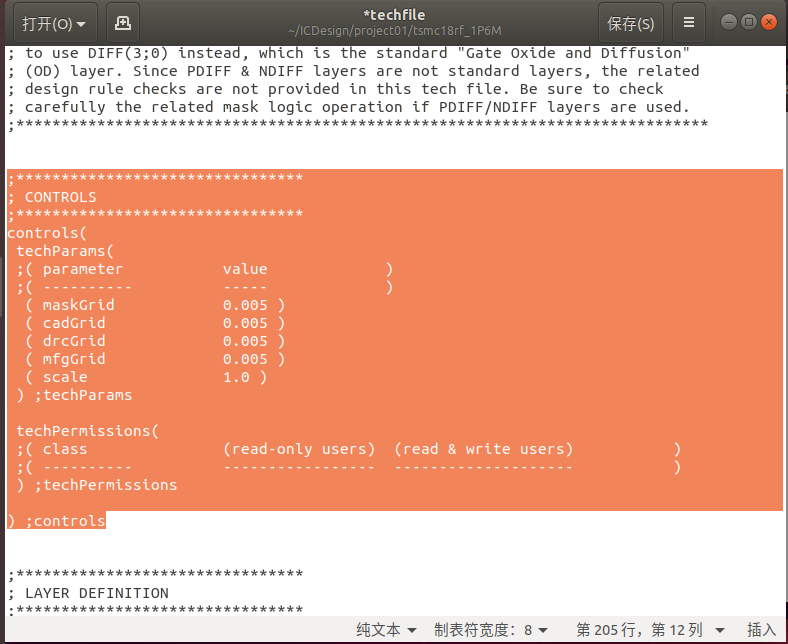 然后打开/home/praise/ICDesign/project01/tsmc18rf_1P6M/techfile,将文件中最后一段Controls剪切到最前面,如下图所示。